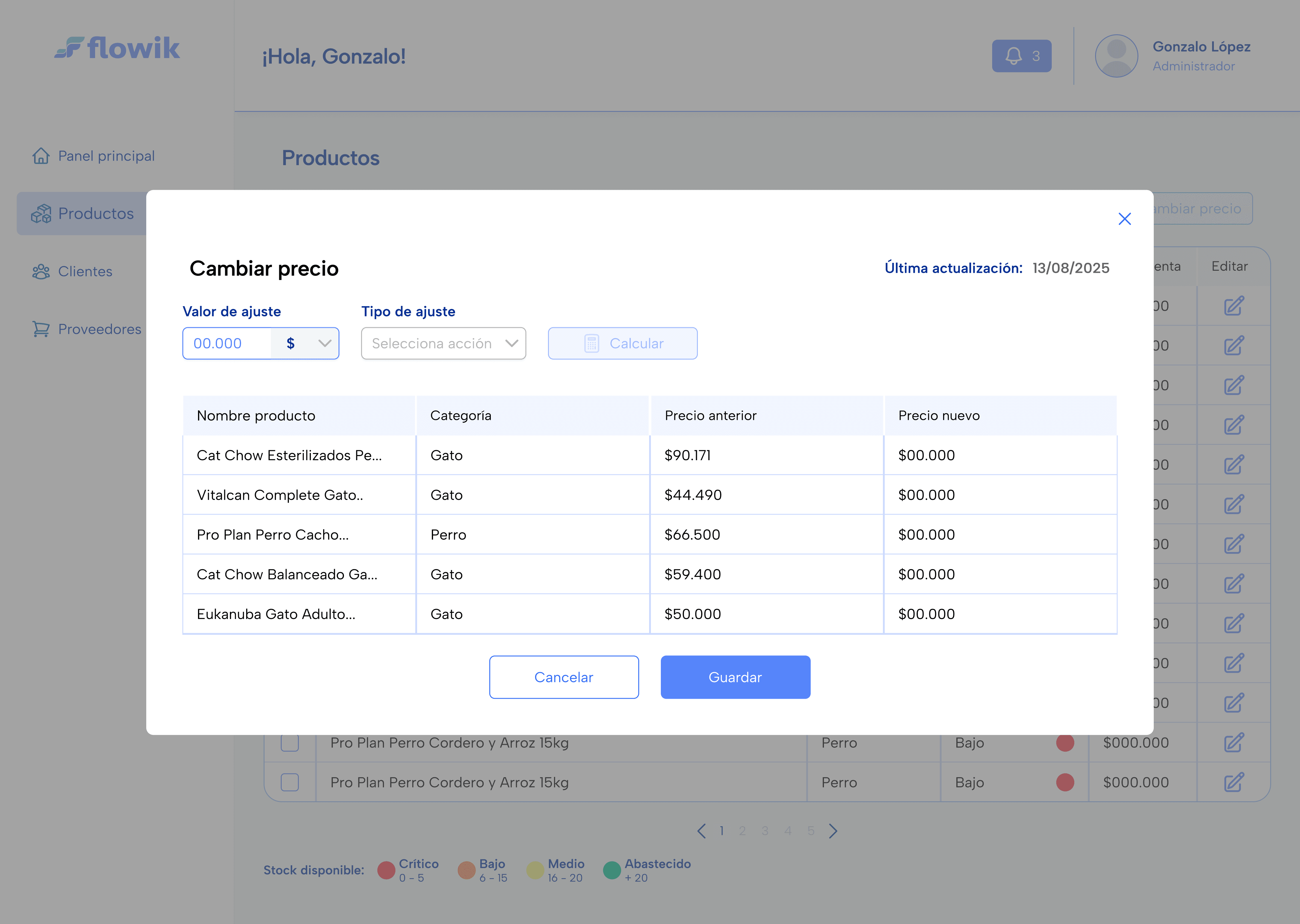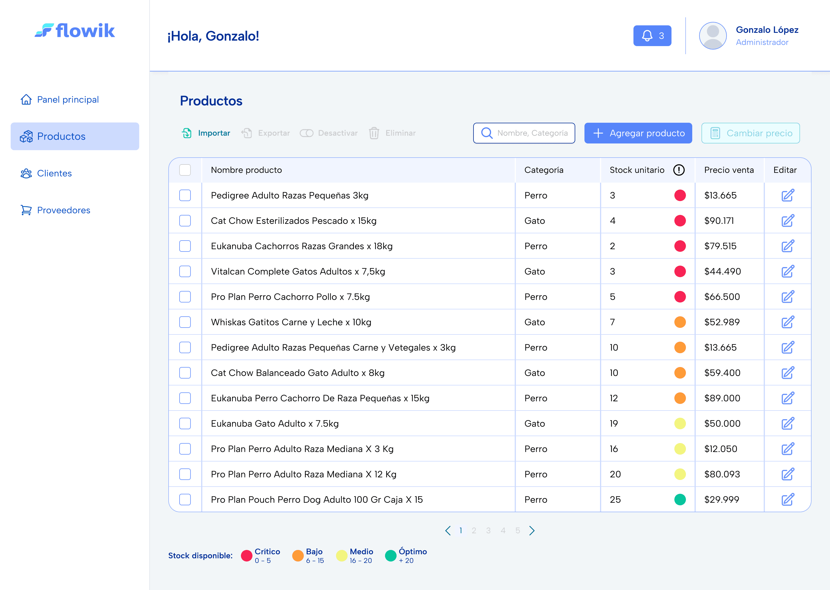 Flowik is an internal-use web application designed for small and micro businesses that sell products. It allows the management of customers, products, stock, suppliers, debts, and reports from a single administrative panel. The system was developed based on needs identified in a real business (Misino Mascotas) and designed to be applicable to other similar industries.